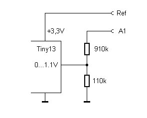 1020 k (110 k + 910 k) den Messbereich auf 0...10,2 V (1,1V*1020/110).