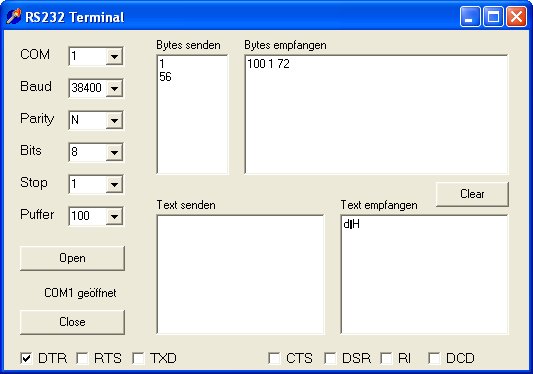 Senden Sie nun ein Byte 1. Das Interface antwortet mit einer Kennung: