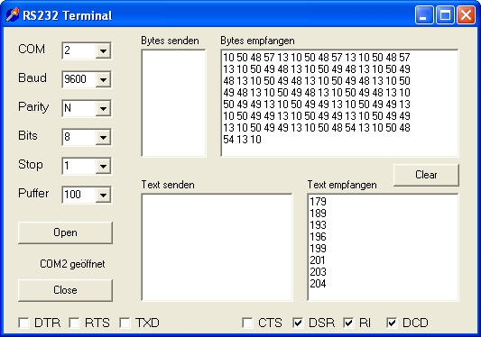 als Zahlenwerte im ASCII-Format gesendet und können direkt in einem Terminal