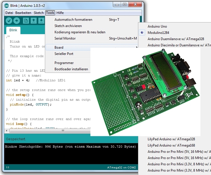 - Wählen Sie unter Werkzeuge-> Platine den Punkt Modulino1284 aus