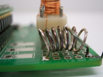 UKW-Antennenanpassung![]() Zur Verbesserung des UKW-Empfangs kann eine UKW-Spule parallel zum FM-Eingang verwendet werden. Diese Spule aus CuAg-Draht hat 7 Windungen und einen Durchmesser von 5 mm. Eine Anzapfung liegt bei der dritten Windung. Eine Dipolantenne wird am besten an der Anzapfung und GND angeschlossen, eine kurze Stabantenne besser direkt am FM-Eingang. Mit der Eingangsimpedanz des Empfängers befindet sich die Spule in Resonanz bei ca. 100 MHz. Durch Verbiegen der Spule kann eine genauere Abstimmung erreicht werden. |