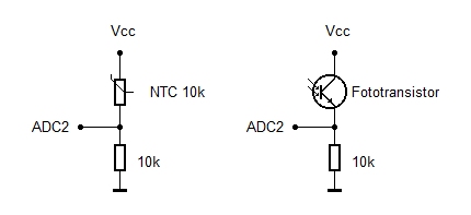 NTC-Temperatursensor und der Fototransistor als Lichtsensor werden in