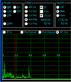 Ein zusätzliches Notch-Filter hilft unerwünschte Träger auszublenden. Das folgende Detailbild zeigt einen Träger knapp zwei kHz unterhalb des AM-Trägers. Mit eingeschaltetem Notchfilter konnte der störende Dauerton vollständig entfernt werden. Die Spektrumanzeige wurde dazu auf den NF-Ausgang geschaltet. Eine rote Linie hilft beim Abgleich des Notchfilters. Erfolg brachte hier ein Ausblenden der Frequenz 1736 kHz mit einer Bandbreite von 50 Hz.