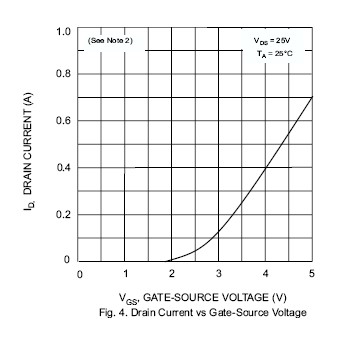 Die Kennlinie zeigt, dass der Transistor bei einer Gate-Spannung von etwa