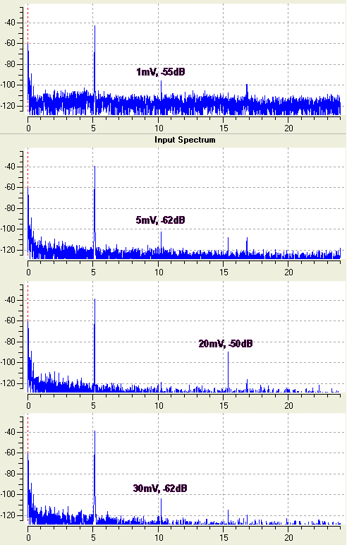 1 mV und 30 mV erkennt man Obertöne bei ca. 10 kHz und bei ca. 15