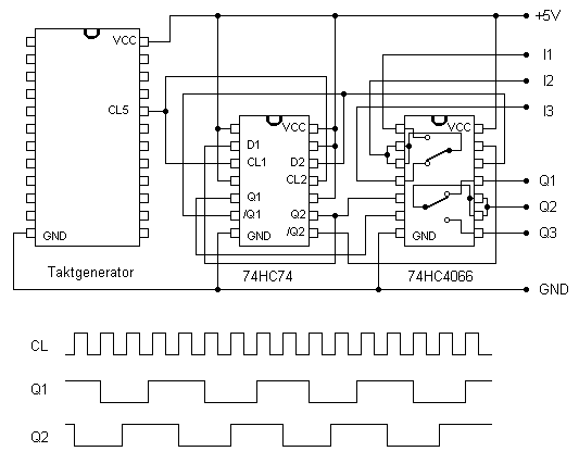 invertiert. D1 ist mit Q2 verbunden und übernimmt jeweils den alten
