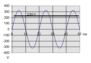 Die Effektivspannung Ueff beträgt 230 V. Das bedeutet, dass an einem