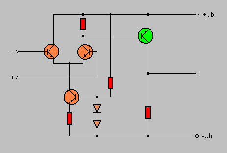 Ausgangsstufe. Man kann also eine vergleichbare Schaltung auch aus Einzeltransistoren