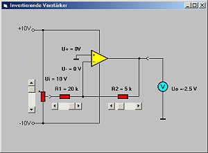 Simulationsprogramm: Invertierender Verstärker (opv2.zip, 4kB, VBRUN300 erforderlich) VB.Net-Version mit Quelltext: fkainka.de/vbnet/Inv.html