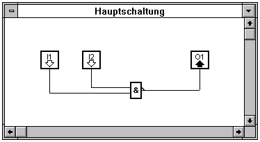 Die Alternative zur reinen Simulation ist die Ansteuerung eines Interfaces. Hier soll das SIOS-Interface eingesetzt werden, um reale Ein- und Ausgänge zu erhalten. Ein erstes Beispiel demonstriert die Funktion eines logischen Gatters. Ein NAND-Gatter besitzt zwei Eingänge und einen Ausgang. Die Funktion läßt sich leicht beschreiben: Nur wenn beide Eingänge logisch Eins sind, wird der Ausgang logisch Null, in allen anderen Fällen ist er hochgesetzt. Man könnte eine reine Simulation mit zwei Schaltern und einer Lampe am Bildschirm aufbauen. Viel motivierender ist es jedoch, reale Signale und reale Anzeigeelemente zu verwenden. Dazu werden die digitalen Ein- und Ausgänge des SIOS verwendet.