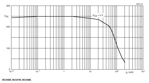 Die Stromverstärkung des BC548B in Abhängigkeit vom Kollektorstrom