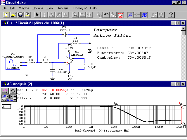 Circuit Maker beruht wie Elektronics Workbench auf den Simulations-Algorithmen von SPICE. Das Programm ist aber noch professioneller. Es hat mehr Bauteile und bringt vor allem noch bessere Messergebnisse. Besonders interessant ist die professionelle Ausgabe von Messergebnissen. Ergebnis-Diagramme sind vollständig beschriftet und lassen sich exakt auswerten.