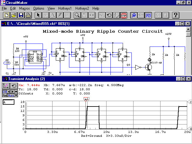 Das Programm erlaubt die gemischte Simulation digitaler und analoger Bauteile. Das folgende Bild zeigt einen Binärzähler mit nachfolgenden Transistor-Schaltstufen. Im Beispiel wurde u.a. das Schaltverhalten eines Transistors BC337 untersucht. Man erkennt eine gewisse Abschrägung der ansteigenden Flanke. Die Anstiegszeit beträgt etwa 200 ns. Allgemein ist der Übergang in den Sperrzustand bei Transistoren nie ganz ohne Verzögerungen möglich. Bei höheren Frequenzen kann das zu einem Problem werden. Es gibt verschiedene Maßnahmen, um das Schaltverhalten zu verbessern, die alle in der Simulation erprobt werden können. Man könnte den Arbeitswiderstand niederohmiger machen und die aktive Abschaltung des Transistors durch einen kleinen Parallelkondensator zum Basiswiderstand unterstützen. Wichtig ist auch, den Transistor nicht übermäßig in die Sättigung zu steuern.