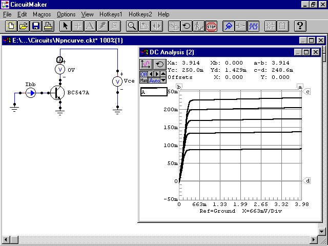 Eine besondere Stärke zeigt Circuit Maker in der DC-Analyse. Man kann hier ganze Kennlinienfelder von Bauteilen erzeugen. Hier die Untersuchung eines BC547A und sein Ausgangs-Kennlinienfeld bei Basisströmen bis 1 mA. Man sieht deutlich den Knick beim Übergang in den Sättigungsbereich und die geringe Steigung bei größeren Kollektor-Emitterspannungen.