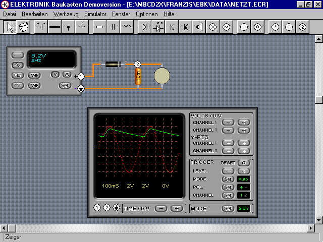 Die Demoversion des Elektronik-Baukasten ist in der Anzahl der gleichzeitig einsetzbaren Bauteile begrenzt, es sind maximal vier. Die beigelegten Schaltungsbeispiele zeigen aber, dass man damit schon einiges anfangen kann. Hier die Schaltung eines einfachen Netzgeräts mit Einweg-Gleichrichter mit Glättungskondensator. Der Transformator wird durch die einstellbare Spannungsquelle ersetzt. Mit der eingestellten Frequenz von nur 2 Hz lässt sich das Laden und Entladen des Kondensators direkt beobachten. Als Last wird hier eine Glühlampe verwendet. Man kann die Frequenz ohne weiteres auf 50 Hz erhöhen, um Ergebnisse für ein reales Netzteil zu erhalten. Die Fragestellung ist z.B., welcher Kondensator bei einer gegeben Belastung eingesetzt werden muss, um eine ausreichend gute Glättung zu erhalten.