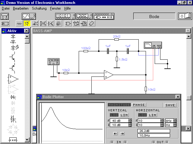Die Simulation umfasst hier auch integrierte Bauteile wie Operationsverstärker. Man kann eine Scaltung zunächst mit einem "idealen" OPV aufbauen und durchmessen. Dann können reale OPV wie z.B. der oft eingesetzte LM324 getestet werden. Die Simulation zeigt die Abweichung zwischen Theorie und Praxis. Vor allem bei hohen Frequenzen stoßen reale OPV schnell an ihre Grenzen. Außer einem Oszilloskop gibt es einen Bode-Plotter zur Untersuchung von Frequenzgängen. Das folgende Bild zeigt die Simulation des Bandpassfilters.