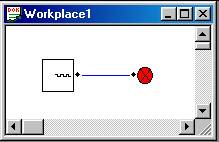 Zunächst werden die Komponenten für die Realisation der Schaltung ausgewählt. In unserem Beispiel werden ein Taktgenerator (Karte switch) und ein Lämpchen (Karte displays) benötigt. Die Karten werden selektiert und die Komponente per Drag and Drop auf den Arbeitsplatz geschoben. Zur elektrischen Verbindung der Bauteilen wird der Mauszeiger auf einen Anschluss bewegt und bei gedrücktem Schalter zum Anschluss des anderen Bauteils geführt. Bei einer nachträglichen Veränderung der Lage einzelner Bauteile werden die Verbindungen nachgeführt. Die Abbildung zeigt die einfache Schaltung eines Blinklichts.
