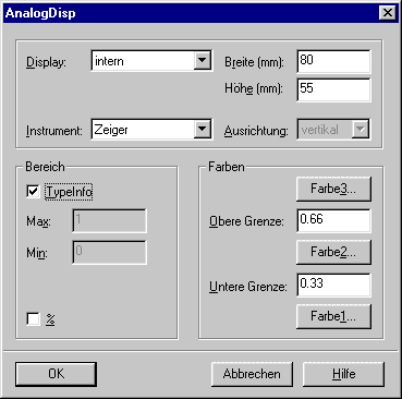 Zusätzliche Einstellungen und Veränderungen sind möglich. Als erstes bietet sich dazu die Größe des Messgeräts an. Ziel sollte ja eine Großanzeige für Demonstrationszwecke sein. Es genügt ein Doppelklick auf das Anzeigemodul, um seine Eigenschaften sichtbar zu machen.