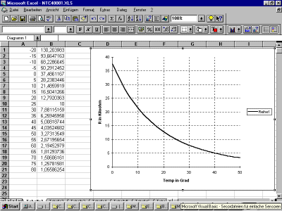 Die Auswertung wird hier für Excel beschrieben. In der A-Spalte kann man sich einige Temperaturen eintragen. Der Widerstand berechnet sich dann für den 10-k-NTC mit der folgenden Formel.