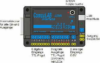 Abb. 1: Die Anschlüsse des CompuLAB-USB