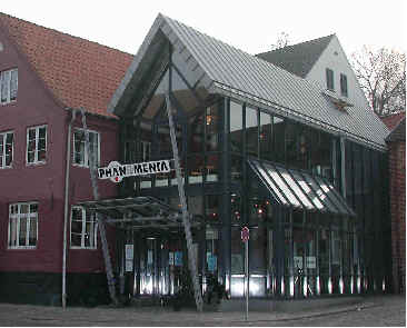 Eingangsbereich der Phänomenta in Flensburg: Moderne Architektur verbindet die Gebäude eines sanierten Kaufmannshofes.