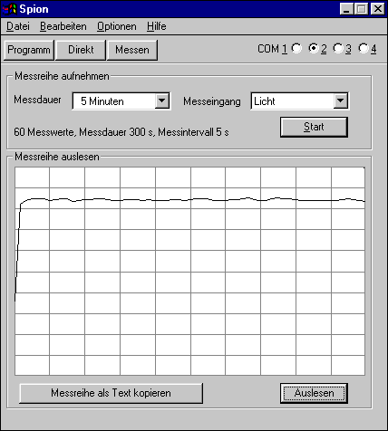 Das Programm Spy hat drei Hauptmenüs: Programm, Direkt und Messen. Beim Start erscheint zunächst das Menü Direkt.