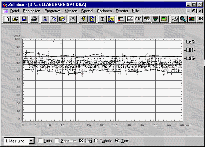 Das Programm Zellabor erfasst Serien von 500 bis 6000 Messwerten in regelmäßigen Intervallen. Jeder einzelne Messwert ist der maximale Pegel in seinem Intervall. Neben der Darstellung von Pegelverläufen über die Messzeit werden die Auswertung von Häufigkeitsverteilungen in Abhängigkeit von Pegeln und die Ermittlung von L01/L95/Leq ermöglicht.