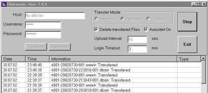 Ein Web-Datentransferprogramm prüft einmal pro Stunde, ob neue Dateien im Austausch-Verzeichnis vorhanden sind und baut dann eine DFÜ-Verbindung und eine FTP-Verbindung zum Web-Server auf. Alle Dateien werden auf den Server kopiert und im Austauschverzeichnis gelöscht. Der gesamte Transfer dauert nur wenige Sekunden.
