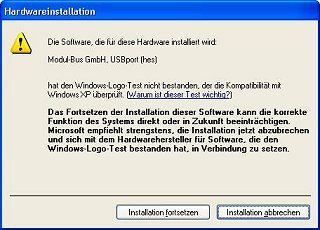 Die MBUSBprt.sys und MBUSBprt.inf sollten sich auf einer Diskette im Laufwerk A: befinden. Dann läuft die Installation des Treibers automatisch. Es gibt nur eine Sicherheitsabfrage, die man mit "Installation fortsetzen" bestätigen muss.