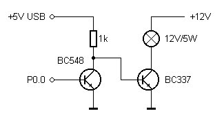 Vielfach soll der Chip vielleicht Lasten an einer zusätzlichen Versorgungsspannung schalten. Dann scheidet die einfache PNP-Stufe aus. Die folgende Schaltung zeigt die Ansteuerung einer Last mit 12V/5W.