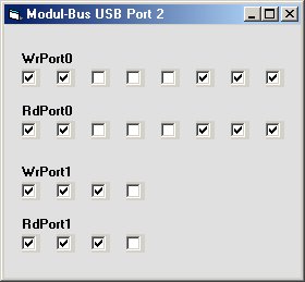 Ein Software-Beispiel für Visual Basic kann hier geladen werden. USBport2.vbp (port2.zip, 4 k, berichtigt 10.12.02). Alle Ports können durch Anklicken verändert werden. Der Ruhezustand nach einem Neustart ist High. Die entsprechenden Lesezustände werden ebenfalls angezeigt. Bei einem Anschluss externer Schaltkontakte muss der Port hochgesetzt bleiben, so dass ein gegen Masse geschlossener Schalter den Pegel verändern kann.