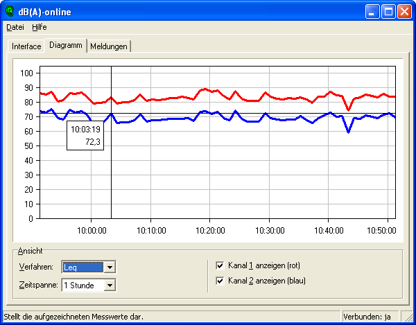Das dB(A)-online Interface wurde für die Überwachung von Fluglärm entwickelt. Bisher gab es deshalb außer der speziellen Fluglärm-Software nur einfache Beispielprogramme in Visual Basic. Inzwischen wird das Gerät jedoch vielfach auch für andere Zwecke eingesetzt, wie beispielsweise den Lärmschutz in Fertigungsbreichen oder die Messung von Verkehrslärm. Viele Anwender haben deshalb nach einer universell einsetzbaren Software gefragt. Um diesem Wunsch nachzukommen, wurde dB(A)-online entwickelt. Mit dB(A)-online können die vom Interface gemessenen Lärmpegel verarbeitet und aufgezeichnet werden. Es werden ein oder zwei Lärmsensoren unterstützt. Die aufgezeichneten Messwerte können in einem Diagramm dargestellt und in eine Textdatei exportiert werden.