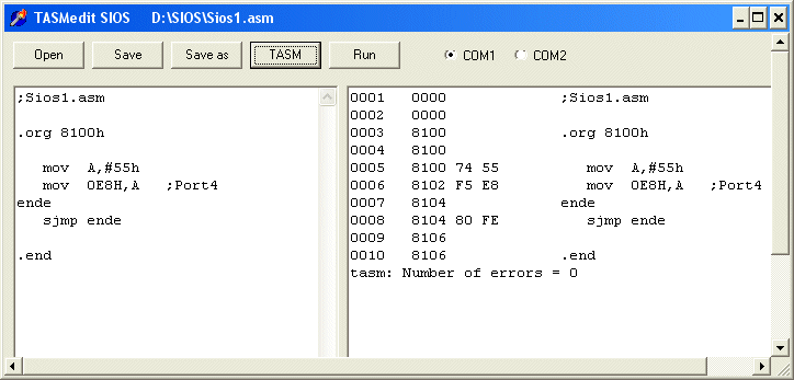 Die Windows-Entwicklungsoberfläche TASMedit wurde ursprünglich für den Basiskurs Mikrocontroller entwickelt und existierte bisher für das Elektor-Flashboard und für das ES52-Flash von AK MODUL-BUS. Es erleichtert die Arbeit mit dem DOS-Assembler TASM. Nun wurde das Programm auch für das SIOS angepasst.