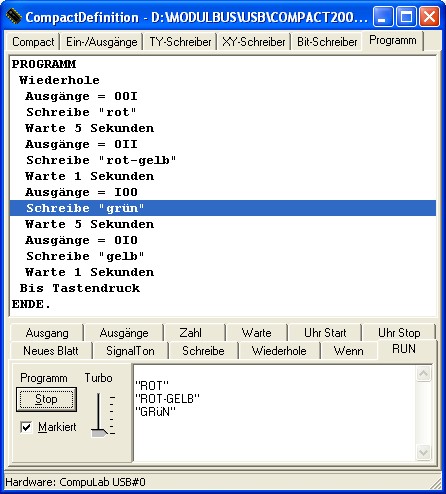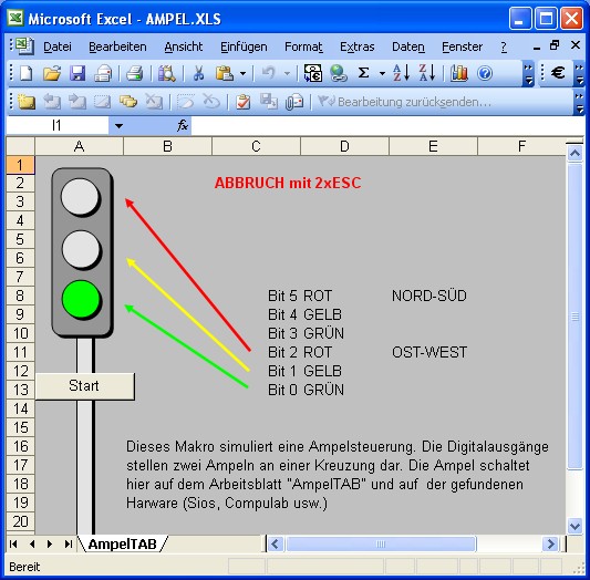 Vielfach wird auch Excel zur Steuerung des CompuLAB oder anderer Interfaces verwendet. Der Umgang mit Word- und Excel-Makros wird in dem Buch MSR mit Word und Excel erläutert. Aus diesem Buch stammt das folgende Beispiel zur Steuerung einer Ampel in Excel: Ampel.XLS (Ampel.zip, 13 KB)