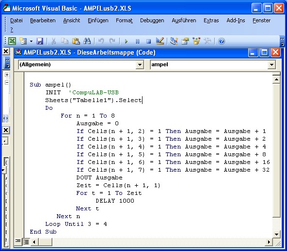 'rt = 3: ge = 6: gn = 4: gr = 40 Sub Grün(bit) If bit = 0 Then ix = 40 Else ix = 4 ActiveSheet.DrawingObjects("grün").Interior.ColorIndex = ix End Sub Sub Rot(bit) If bit = 0 Then ix = 40 Else ix = 3 ActiveSheet.DrawingObjects("rot").Interior.ColorIndex = ix End Sub Sub Gelb(bit) If bit = 0 Then ix = 40 Else ix = 6 ActiveSheet.DrawingObjects("gelb").Interior.ColorIndex = ix End Sub Sub ampel() INIT 'CompuLAB-USB Blatt$ = "AmpelTAB" ThisWorkbook.Sheets(Blatt$).Activate a$ = "&h0C&h0C&h0C&h0C&h14&h26&h21&h21&h21&h21&h21&h22&h34" Do ix = 1 Do x$ = Mid$(a$, ix, 4) If x$ <> "" Then ix = ix + 4 Dez = Val(x$) Rot (Dez And 4) Gelb (Dez And 2) Grün (Dez And 1) DOUT Dez Calculate DELAY 1000 End If Loop Until x$ = "" Loop Until 3 = 4 End Sub