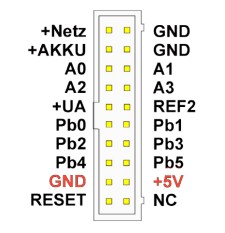 Bei Geräten, die vor dem 17.11.06 geliefert wurden, muss während des Update-Vorgangs eine Betriebsspannung von +5 V über den Sammelstecker (rot gekennzeichnete Anschlüsse) zugeführt werden, wobei beide Betriebsschalter aus bleiben sollen. (Die externe Spannung muss verwendet werden, weil das Boot-Programm in der ersten Version die Ausgangsspannung des Spannungsreglers umschaltet und leider selbst nicht neu geflasht werden kann.)