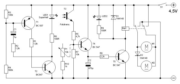 LED2 und das Relais Strom, der wiederum die Motoren umpolt. Motor 1 ändert