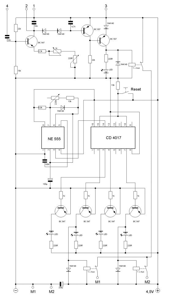 Der Abgleich des Metalldetektors ist über das 1k- bzw. 220R-Poti vorzunehmen.