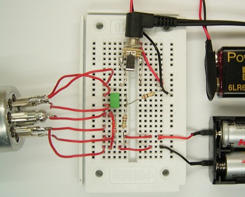Wenn man an Pin 1 und Pin 8 der Röhre eine Heizspannung von 2,2V bis