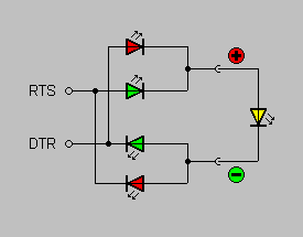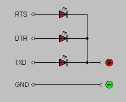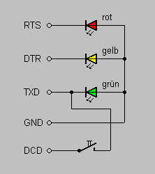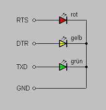 rot-RTS, gelb-DTR, grün-TXD. Alle LEDs werden gegen Masse geschaltet.